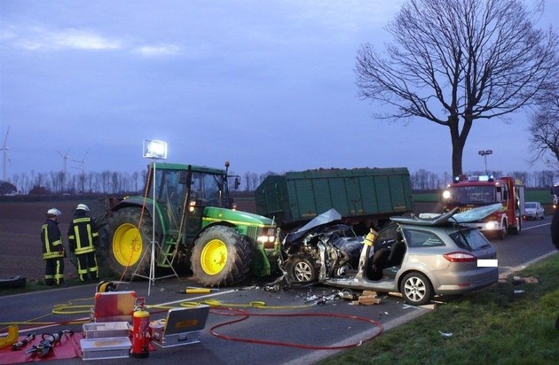 Gegen 07:00 Uhr befuhr eine 50-jährige Frau aus Titz mit ihrem Pkw die L 241 von Titz in Richtung Jackerath. In Höhe einer kleineren Steigung beabsichtigte sie, einen vor ihr fahrenden landwirtschaftlichen Zug zu überholen. Aus bislang ungeklärten Gründen übersah sie dabei das entgegen kommende Rübentransportfahrzeug, das von einem 29-jährigen Mann aus Mönchengladbach gesteuert wurde. Es kam zu einem Frontalzusammenstoß, in dessen Verlauf die 50-Jährige in ihrem Wagen eingeklemmt wurde. Durch die Freiwillige Feuerwehr Titz wurde sie aus ihrem Fahrzeug befreit und mittels eines Rettungshubschraubers zur weiteren Behandlung in ein Krankenhaus verbracht. Ein Anhänger des Gespanns kippte zur Seite und verlor die komplette Ladung Zuckerrüben.