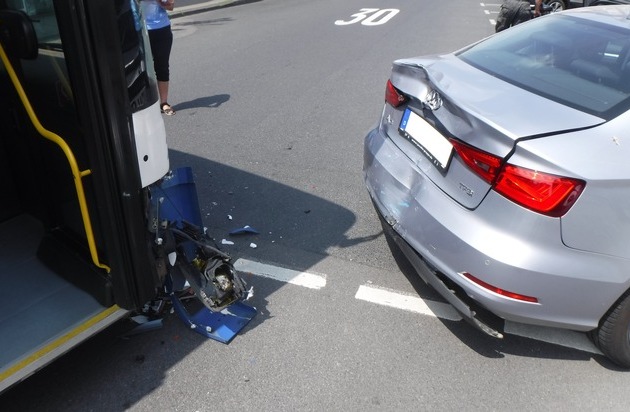 Eine 27 Jahre alte Frau aus Düren hatte ihren Pkw in einer Parktasche schräg neben der Fahrbahn der Oberstraße geparkt. Als sie ihren Wagen gegen 13:20 Uhr rückwärts aus der Parkposition heraussetzen wollte, fuhr sie gegen einen herannahenden Linienbus. Dieser hatte die Stürtzstraße befahren und war nach links in die Oberstraße abgebogen. Während die Unfallverursacherin und die 57-jährige Busfahrerin unverletzt blieben, wurde ein weiblicher Fahrgast des Busses leicht verletzt. Die 47 Jahre alte Frau aus Düren war bereits aufgestanden und hielt sich im Gang auf, da sie an der nächsten Haltestelle aussteigen wollte. Durch den Zusammenstoß wurde sie leicht verletzt, eine medizinische Versorgung vor Ort war jedoch nicht erforderlich.