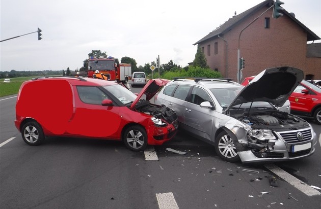Ein 34 Jahre alter Autofahrer aus Kreuzau befuhr die L 13 aus Richtung Geich kommend und beabsichtigte gegen 16:40 Uhr nach links auf die B 264 in Fahrtrichtung Düren einzubiegen. Dabei übersah er offensichtlich den Pkw eines 31-jährigen Düreners. Dieser war auf der L 13 geradeaus in Richtung Geich unterwegs. Als Folge kam es zu einem Zusammenstoß der beiden Wagen im Kreuzungsbereich. Die Fahrzeugführer zogen sich leichte Verletzungen zu, ein Transport in ein Krankenhaus war aber nicht erforderlich. Die Besatzung eines Rettungswagens versorgte den Kreuzauer. Der Dürener beabsichtigte selbständig einen Arzt aufzusuchen.