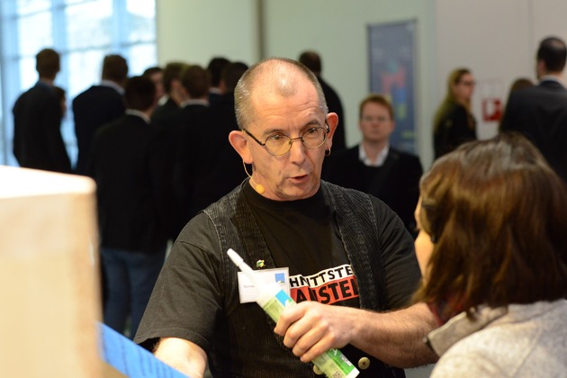 Als Überraschungsgäste tauchten die Zimmerer der Meisterschule Kaiserslautern auf. Sie führten am pro clima Stand den Zimmerklatsch auf.