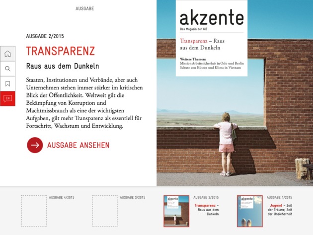 Mit der Entwicklung einer App zum Kundenmagazin "akzente" begleiten die Societäts-Medien die Deutsche Gesellschaft für Internationale Zusammenarbeit (GIZ) GmbH bei einem weiteren Schritt in Richtung digitale Kommunikation. Die inhaltlich und gestalterisch anspruchsvolle Magazin-App ist eine Reaktion auf das veränderte Leseverhalten der Zielgruppe.