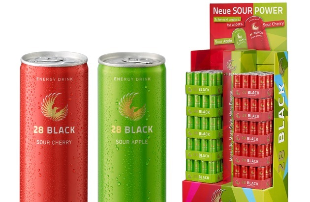 Der Energy Drink 28 BLACK erweitert seine Produktrange um die Geschmacksvariante "Sour". Gleich zwei neue Sorten werden ab Mitte Februar in der 28 BLACK-Familie begrüßt: 28 BLACK Sour Cherry und 28 BLACK Sour Apple bieten dem Konsumenten ein sauer-prickelndes Geschmackserlebnis mit Energie-Kick.