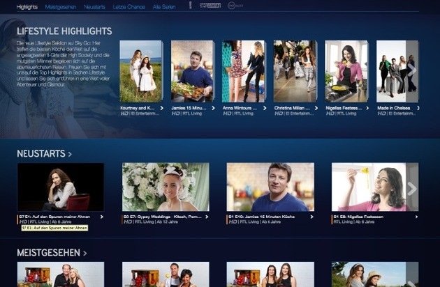 - Eigener Lifestyle-Bereich speziell für die Inhalte der Partnersender E! Entertainment, RTL Living und TNT Glitz HD auf Sky Go - Rund 100 neue Inhalte pro Monat in den Kategorien "Kochen", "Abenteuer & Reisen", "Reality" und "Modern Life" - Kommende Programmhighlights: "Keeping Up With the Kardashians" (E! Entertainment), "Knife Fight - Das härteste Kochduell der Welt" (RTL Living) und "InStyle - Das TV-Magazin" (TNT Glitz HD) 2.4.2015 - Lifestyle wird bei Sky Go jetzt großgeschrieben: Ab sofort bekommen alle Entertainment-Fans einen eigenen Lifestyle-Bereich, in dem sie jeden Monat rund 100 neue Inhalte der Sender E! Entertainment, RTL Living und TNT Glitz HD auf Abruf finden. Dort ist für jeden Geschmack etwas dabei - von Reality Shows wie "Keeping Up With The Kardashians" (E! Entertainment), über Kochsendungen wie "Knife Fight - Das härteste Kochduell der Welt" (RTL Living), Abenteuer-, Reise- und Gartensendungen bis hin zu Lifestyle- und Mode-Eigenformaten aus dem Hause Turner für TNT Glitz HD wie "InStyle - Das TV-Magazin". Sky Go steht allen Sky Kunden ab dem Sky Welt Paket kostenlos zur Verfügung, die damit auch Zugriff auf die neuen Lifestyle-Sendungen haben. Die Programme können im Web auf www.skygo.de und über die kostenlose Sky Go App auf dem iPad, iPhone, iPod touch, auf Android-Smartphones und -Tablets sowie auf der Xbox 360 flexibel abgerufen werden. Peter Schulz, Vice President On Demand Programming bei Sky Deutschland: "Mit dem Lifestyle-Bereich auf Sky Go bauen wir das umfangreiche und einzigartige Angebot unserer On-Demand-Services weiter aus. Damit bieten wir noch mehr hervorragende Programminhalte unserer Partnersender auf Abruf und bereichern abermals das Gesamterlebnis und die Flexibilität für unsere Kunden." Programmhighlights: E! Entertainment: "Keeping Up with the Kardashians" "Botched" "Christina Milian Turned Up" "Made in Chelsea" "Kourtney and Khloé Take the Hamptons" RTL Living: "Knife Fight - Das härteste Kochduell der Welt" (u.a. mit Elijah Wood, Drew Barrymore) "David Beckham - Abenteuer Amazonas" "Alan Titchmarsh - Liebe deinen Garten" "Anna Wintours Fashion Fund" "The Asgard Project - 12 Tage in der Steilwand" "Autana - Expedition auf den heiligen Berg" TNT Glitz HD: "Donna Hay: Fast, Fresh, Simple" "InStyle - Das TV-Magazin" "My Kitchen Rules" "The Outdoor Room with Jamie Durie" "No Ruhmservice" "Mein Leben auf dem Land" Über Sky Deutschland: Mit über 4,1 Mio. Kunden und einem Jahresumsatz von rund 1,7 Mrd. Euro ist Sky in Deutschland und Österreich Pay-TV-Marktführer. Das Programmangebot besteht aus Live-Sport, Spielfilmen, Serien, Kinderprogrammen und Dokumentationen. Sky Deutschland beschäftigt rund 2.500 Mitarbeiter und hat seinen Hauptsitz in Unterföhring bei München. Das Unternehmen ist Teil von Europas führender Unterhaltungsgruppe Sky plc (Stand: 31.12.2014).