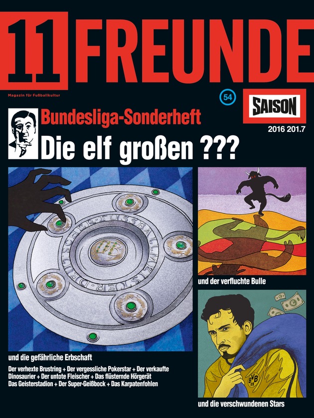 Im August startet wieder die Fußball-Bundesliga. Zur richtigen Einstimmung auf die neue Saison ist ab heute die 177. Ausgabe der 11FREUNDE als Bundesliga-Schwerpunktheft im Handel erhältlich. Auf 164 Seiten gibt es eine unterhaltsame Vorbereitung auf die neue Spielzeit. Außerdem enthält das Bundesliga-Sonderheft den 196-seitigen Pocketplaner "Alle Teams, Spieler & Termine" sowie ein Spielplanposter für die 1. und 2. Bundesliga. Nach den kreativen Covern der letzten Jahre, die auf "Star Wars", "Breaking Bad" oder "Zurück in die Zukunft" anspielten, präsentiert sich das Titelbild für die neue Saison im Look der Hörspiel-Reihe "Die drei ???".
