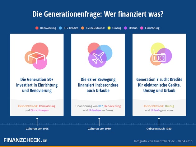 - Zuverlässigster Kreditnehmer ist die Generation 50+Unterschiedliche Lebensphasen bringen unterschiedliche Bedürfnisse mit sich. Traditionelle Kreditbereiche wie etwa die Finanzierung einer Renovierung oder eines Autos stehen dabei für alle vor 1980 geborenen Personen im Fokus. Jüngere Menschen hingegen nutzen Finanzierungen, um die Welt zu bereisen. Das ergab eine aktuelle Auswertung des Finanzvergleichsportals FINANZCHECK.de.
