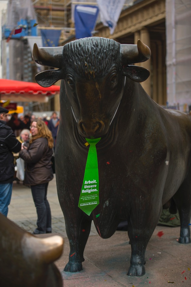Bild anbei: Bulle mit Schlips vor der Frankfurter Börse. Guerilla-Aktion zur Bewerbung der FR Serie "Arbeit. Unsere Religion." Fotograf: Andreas Arnold. Weitere Bilder zur Ansicht in der FR Bildergalerie unter: http://ots.de/0Uoo7