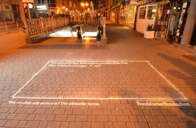 Wie anschaulich das Thema sein kann, beweisen seit Samstagmorgen Kreidebilder auf hochfrequentierten Plätzen und Straßen in Frankfurt: Während einige Kreidebilder einen Quadratmeterpreis-Vergleich vornehmen, stellen andere Kreidebilder plastisch dar, mit wie viel bzw. wie wenig Platz einige Bevölkerungsgruppen tatsächlich auskommen müssen. Neben dieser aufmerksamkeitsstarken Guerilla-Aktion wird außerdem auf Außenwerbeflächen, Infoscreens, in den eigenen Medien und auf Facebook für die Serie "Wie wollen wir wohnen?" geworben.