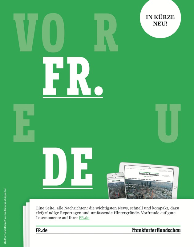 Die Werbemotive rund um den FR Website-Relaunch spielen mit der neuen URL und zeigen auf plakativen Hintergründen Headlines, die den FR-Markenkern betonen: VorFReu.DE, FReiDEnker, FReihanDEl, FReuDEnschrei und FRieDEnspreis. Der Relaunch wird zunächst über Owned Media beworben. Ab dem 6. März startet die Kampagne auch mit Paid Media über Online und Social Media Marketing.
