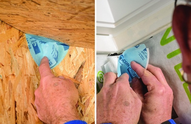 Mit TESCON INVEX und TESCON INCAV gibt es bereits gut funktionierende Lösungen für rechtwinklige Eckanschlüsse. "Nur hat nicht jede Ecke auf einer Baustelle exakt 90 Grad. Was den Verarbeitern noch fehlte war also ein Element, das sich flexibel an jede Winkelform anpassen lässt", erklärt Michael Förster von der pro clima Anwendungstechnik die Idee hinter TESCON TANGO. "Außerdem hat sich gezeigt, dass man gerade in engen Winkeln mit einer offenen Klebefläche schnell mal hängen bleibt, bevor man die eigentliche Ecke erreicht hat. Auch hier macht das neue Patch die Arbeit einfacher und damit sicherer." Der Kniff: Die Trennfolie wird zunächst nur von einem etwa 1 Zentimeter breiten Fixierstreifen gelöst. So lässt sich das vorgefaltete Patch exakt positionieren, bevor man die übrige Trennfolie nach und nach abzieht und die Klebefläche fest andrückt. Dabei ist das Patch so zugeschnitten, dass genügend Trennfolienrand übersteht, um ihn gut greifen zu können. Zudem wird selbst der vielfach heikle Eckpunkt automatisch abgedichtet.