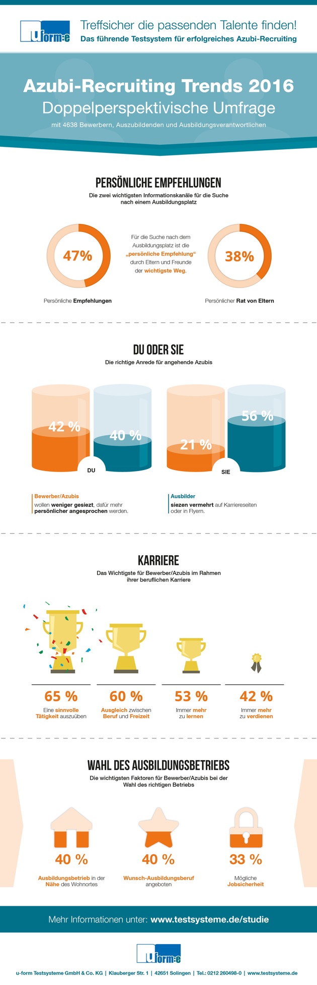 Seit sieben Jahren führt u-form Testsysteme die Studie Azubi-Recruiting Trends durch. Von Dezember 2015 bis März 2016 haben deutschlandweit 3.343 Azubi-Bewerber und Auszubildende sowie 1.295 Ausbildungsverantwortliche an der Online-Befragung teilgenommen. Prof. Dr. Christoph Beck (Hochschule Koblenz, Herausgeber des Standardwerks Ausbildungsmarketing 2.0) hat die Studie wissenschaftlich begleitet. Unterstützt wurde die Umfrage durch den Sourcingpartner blicksta, die Plattform zur Berufsorientierung für Schüler. Zusätzlich zur branchenübergreifenden Edition erscheint im Juni 2016 eine "Branchenedition Hotel und Gastronomie 2016" der Studie als gemeinsame Initiative von u-form Testsysteme als Initiatorin, des DEHOGA Bundesverbands als Verbands- sowie der Allgemeinen Hotel- und Gastronomiezeitung als Medienpartner. u-form Testsysteme gibt zudem in Zusammenarbeit mit dem Medienpartner MM MaschinenMarkt in diesem Jahr erstmals eine "Branchenedition Maschinenbau" heraus. Mit dem Erlös aus dem Verkauf der Studie unterstützt u-form Testsysteme die Initiative JOBLINGE. Bestellung unter www.testsysteme.de/studie.