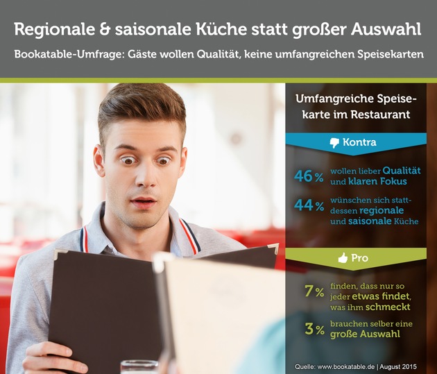 "Slow Food, regionale Küche und bewusste Ernährung sind Themen, die sich mittlerweile auch in unserem Verhalten beim Essengehen widerspiegeln", sagt Thomas Bergmann, Sales Director bei Bookatable. "Will man seinen Kunden Qualität und nachhaltige Produkte anbieten, dann ist das als Generalist mit umfangreicher Speisekarte kaum machbar. Denn alle nötigen Lebensmittel frisch einzukaufen ist teuer und vieles landet dann eben zwangsläufig ungenutzt im Müll. Oder Restaurants müssen auf Fertigprodukte setzen - zu Lasten der Qualität. Das wissen mittlerweile auch die Gäste und suchen sich bewusst Alternativen."