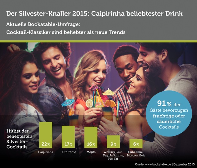 Das Jahresende nähert sich und viele Menschen freuen sich schon jetzt auf ein feucht-fröhliches Silvester. Besonders an diesem Abend gilt für die meisten: Der Alkohol darf gerne fließen. Was jedoch steht gerade auf der Liste der beliebtesten Getränke ganz oben? Bookatable.de, der Online-Reservierungs-Service, wollte es wissen und fragte knapp 450 Gäste nach ihren Vorlieben bei Cocktails. Eins scheint festzustehen: Sauer ist im Trend. 44 Prozent der Befragten entscheiden sich eindeutig für säuerliche Drinks gegenüber sahnigen oder süßen.