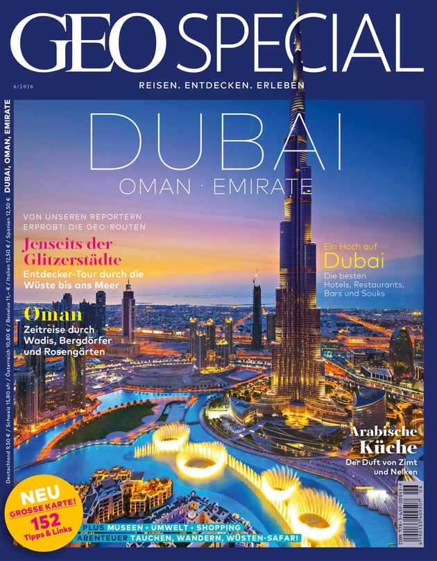 GEO SPECIAL "Dubai, Oman, Emirate" ist ab sofort im Handel erhältlich und kostet 9,50 Euro. Das Heft inklusive DVD mit der Dokumentation "Dubai und Oman - Abendteuer in der Wüste und vor der Küste" ist für 16,50 Euro erhältlich.