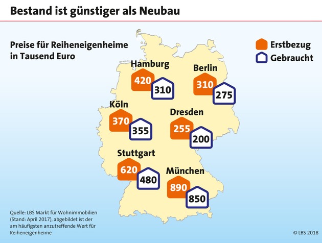 Das Wohngebiet ist erschlossen, die Einkaufsmöglichkeiten liegen gleich in der Nähe, und zu Schule oder Kindergarten ist es auch nicht weit: Viele Käufer reizt an Bestandsimmobilien vor allem die schon gut ausgebaute Infrastruktur. Auch die Tatsache, dass sie sich bereits im Vorfeld ein genaues Bild vom künftigen Zuhause machen können und sich nicht nur auf Zeichnungen und Baupläne verlassen müssen, fällt positiv ins Gewicht. Hinzu kommt das Preisargument: Gebrauchte Immobilien sind in Deutschland deutlich günstiger als Neubauten. So bezahlen Käufer eines Reihenhauses aus zweiter Hand im Schnitt 23 Prozent weniger gegenüber einem Neubau. Eine gebrauchte Eigentumswohnung ist rund 40 Prozent günstiger als eine neu erbaute, wie der "Markt für Wohnimmobilien 2017" zeigt. "Je nach Baujahr und Zustand der Immobilie sollten Käufer allerdings zusätzliche Kosten für die Instandhaltung oder für Modernisierungen, etwa aufgrund energetischer Mindestanforderungen, von vornherein in die Finanzierung einkalkulieren", rät Monika Grave von der LBS.