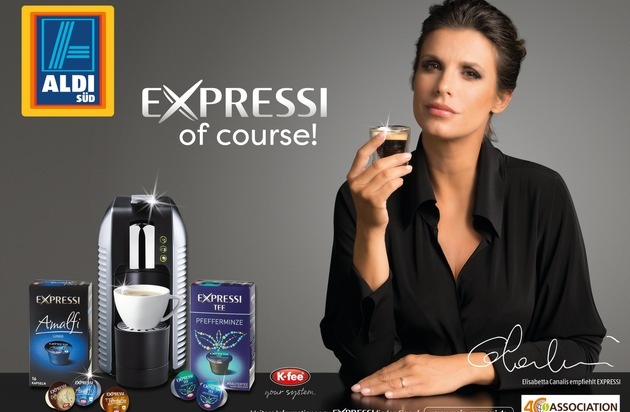 Seit über zwei Jahren überzeugt das Kapselsystem EXPRESSI durch Top-Qualität verbunden mit einem hervorragenden Geschmack zu günstigen Preisen. Für die neue Kampagne "EXPRESSI - of course!" erhält die Unternehmensgruppe ALDI SÜD erstmals prominente Unterstützung. Ab sofort ist Schauspielerin und Model Elisabetta Canalis das Werbegesicht von EXPRESSI.