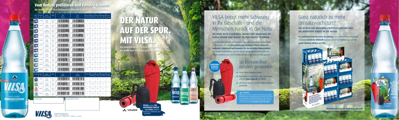 Für die diesjährige Aktion greift VILSA auf ihre Klassiker zurück: die vier Sorten VILSA Mineralwasser machen mit attraktiven Sonderetiketten auf der 12x1 Liter Mehrwegflasche auf das große Gewinnspiel aufmerksam, das Ihre Herzen als Naturfreund höher schlagen lässt. Wie das geht? Einfach VILSA Mineralwasser kaufen, Kassenbon auf www.vilsa.de hochladen und mit etwas Glück 1 von 50 Outdoor-Paketen der Marke VAUDE mit Rucksack, Schlafsack und Isomatte gewinnen.
