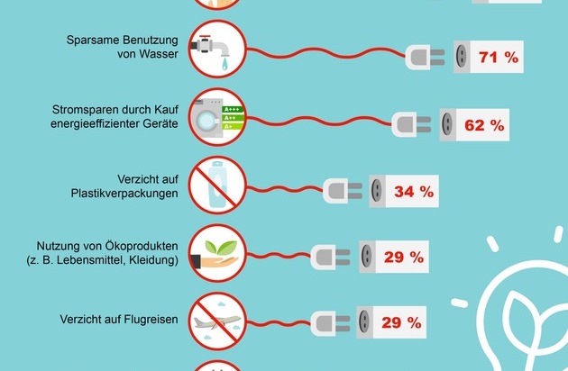 Bei der Umfrage wurde unter anderem auch danach gefragt, mit welchen Verhaltensweisen die Deutschen die Umwelt noch schützen. Ganz an erster Stelle steht übrigens aktives Stromsparen, zum Beispiel durch energieeffiziente Geräte oder Licht ausschalten: Drei Viertel aller Deutschen spart so Energie. Das geht übrigens auch gut im Urlaub durch drei ganz einfache Maßnahmen: Den Kühlschrank während des Urlaubs ausschalten und abtauen lassen. Das spart nicht nur Energie während der Abwesenheit, sondern auch nach der erneuten Inbetriebnahme. Denn sowohl Kühl- als auch Gefrierschrank verbrauchen weniger, wenn durch das Abtauen eventuell vorhandene Eisrückstände entfernt werden. Ein weiterer Tipp: Alle Geräte (auch die auf Standy-By) ausschalten. Fernseher, DVD-Player, Sat-Receiver oder Computer laufen oft munter auf Stand-by weiter, so lange sich das Kabel in der Steckdose befindet. Gleiches gilt für Notebooks, Radiowecker, Deckenfluter oder Akkuladegeräte, die ein separates Netzteil haben. Bevor es in die Ferne geht, lohnt sich also ein Rundgang durch die Wohnung, bei dem man den Stecker zieht oder die Steckerleiste ausschaltet.