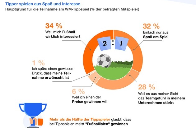 Etwas desillusioniert sind indessen die WM-Tipper der Befragung, wenn es darum geht, wer in ihren Tipprunden normalerweise den Hauptgewinn abräumt. So sagen mehr als die Hälfte (52 Prozent), dass meist die Mittipper gewinnen, die am wenigsten Ahnung von Fußball haben. Und das scheinen durchaus einige zu sein - denn gut ein Drittel tippen hauptsächlich aus "Spaß am Spiel" mit. Weitere 28 Prozent sehen in Tippspielen eine Möglichkeit, die Arbeitsatmosphäre zu verbessern, während 34 Prozent aus reinem Fußballinteresse teilnehmen.