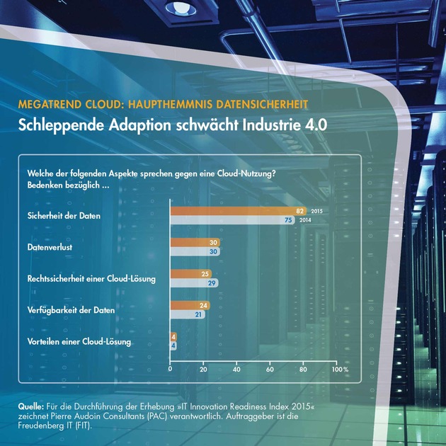 Die Cloud steht unter dem Generalverdacht der Datenunsicherheit - auf diesen Nenner lässt sich die anhaltend hohe Skepsis gegenüber Cloud-Services bringen. So ein Ergebnis des jährlich im Auftrag der Freudenberg IT erhobenen IT Innovation Readiness Index von Pierre Audoin Consultants (PAC). Sicherheitsbedenken bremsen den Durchbruch der Wolken-IT in der deutschen Fertigungsindustrie stärker aus denn je. 82 Prozent der Befragten nennen die fehlende Datensicherheit als größte Hürde - und damit sieben Prozentpunkte mehr als im vergangenen Jahr. An zweiter Stelle steht mit 30 Prozent unverändert die Angst vor dem Datenverlust. Skeptisch gegenüber der Rechtssicherheit einer Cloud-Lösung sind rund 25 Prozent der Unternehmen - vier Prozentpunkte weniger als 2014.