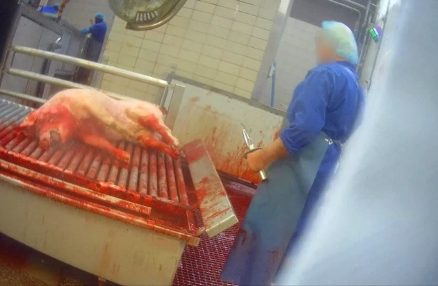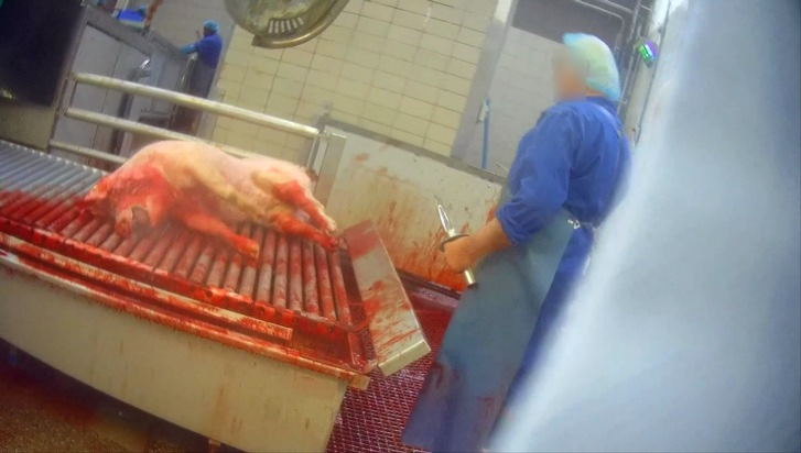 Bei den Rindern scheitert die Betäubung regelmäßig. Sie erwachen blutend am Schlachtband. Immer wieder versagt das Personal, Falltore werden krachend auf Rinderrücken geschlagen, und Tiere brechen schon vor dem Schuss erschöpft vom Stress und von Elektroschocks zusammen. "Es ist erschütternd zu sehen, wie besonders die absolut zerstörten Milchkühe nach jahrelanger Ausbeutung noch auf den letzten Metern gequält werden. Die Tiere aus Haut und Knochen sind das bevorzugte Burgerfleisch von McDonald's." so Friedrich Mülln von SOKO Tierschutz. Die Schweinebetäubung sorgt für ein grausames Erwachen am Schlachtband. Minutenlange Schnappatmung, blinzelnde Augen und Tiere, die gegen den Einzug in das Brühbad kämpfen. Der traurige Höhepunkt: Mindestens ein Tier wird bei Bewusstsein ins heiße Wasser gezogen und kämpft um sein Leben. Arbeiter sehen bei den Zuständen mitleidslos zu. Diese Zustände sind Alltag, zigfach dokumentiert in wenigen Stunden. Und das, obwohl der Schlachthof sogar die Bio Zulassung hat und über ein bis zu sechsköpfiges Veterinärteam verfügt. Zwei Veterinärstudenten sehen zu, als Rinder aus der Betäubung erwachen, ermerkt wird das in dem Protokoll aber nicht. Stattdessen prahlt einer damit, die Tiere selber mit dem Elektroschocker misshandelt zu haben.