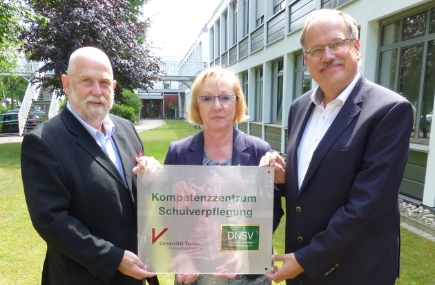 Im Rahmen einer Arbeitsbesprechung über die weiteren Aktivitäten des Kompetenzzentrums für Schulverpflegung an der Universität Vechta, wurde es nun auch öffentlich sichtbar gemacht, dafür übergaben die paritätischen Leiter des Zentrums - Prof. Dr. Steffen Wittkowske und der Vorsitzende des DNSV Dr. Michael Polster - der Präsidentin Prof. Dr. Marianne Assenmacher ein entsprechendes Schild für die Außenwerbung.