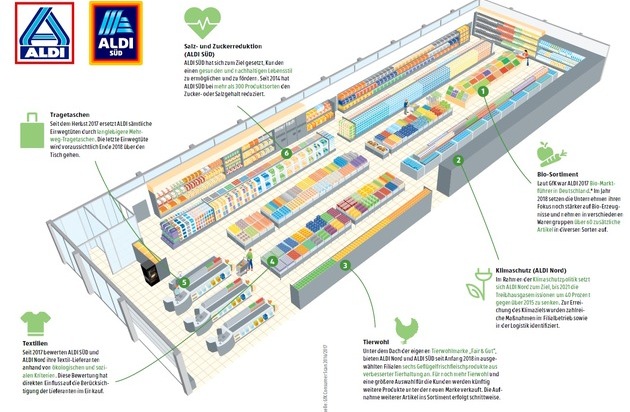 Zusammen mit dem Nachhaltigkeitsbericht veröffentlicht ALDI Nord eine Klimaschutzpolitik mit dem Ziel, bis 2021 die Treibhausgasemissionen um 40 Prozent gegenüber 2015 zu senken. Zur Erreichung des Klimaziels wurden zahlreiche Maßnahmen im Filialbetrieb sowie in der Logistik identifiziert. Die langfristig ausgerichtete Klimastrategie umfasst beispielsweise den Ausbau von Fotovoltaikanlagen sowie den Einsatz von LED-Beleuchtung und innovativer Kältetechnik. ALDI SÜD wird einen weiteren Schwerpunkt auf den Bereich gesunde Ernährung legen. Seit 2014 hat der Discounter bei mehr als 300 Produktsorten den Zucker- oder Salzgehalt reduziert.