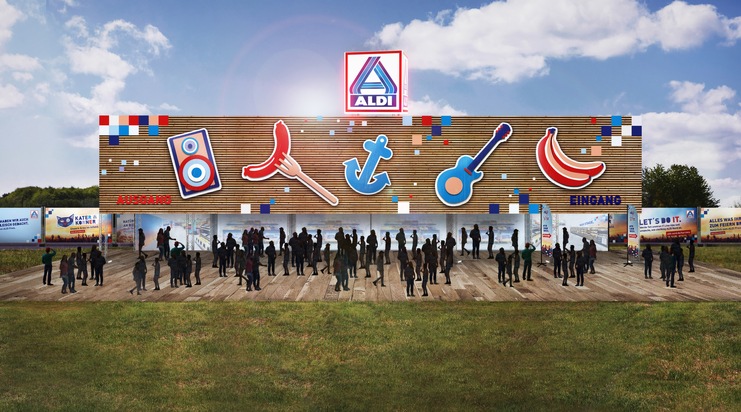 Eine riesige Außenfassade, bunte Dekoelemente und darauf ein beleuchteter ALDI Würfel - so wird der XXL ALDI beim diesjährigen DEICHBRAND Festival in Cuxhaven-Nordholz aussehen. ALDI Nord ist erstmals mit einer 2.100 Quadratmeter großen Filiale vor Ort und versorgt die 55.000 erwarteten Festivalbesucher vom 19. bis 23. Juli mit Lebensmitteln, Getränken und Festivalequipment.