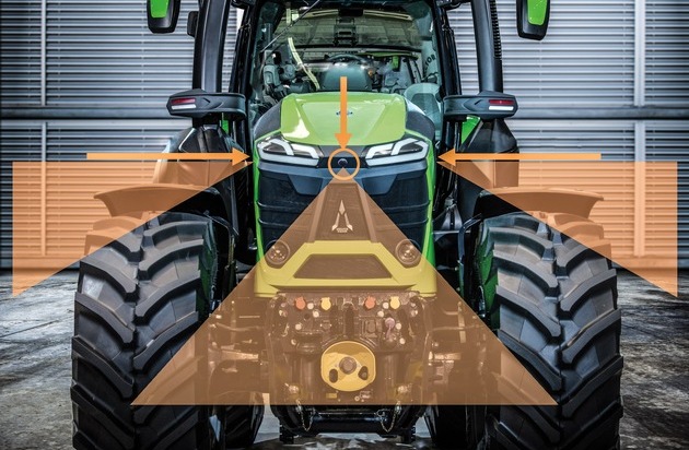 Bei diesen "Augen" handelt es sich um drei digitale Kameras hinter dem Kühlergrill des Traktors. Sie erlauben dem Fahrer Bereiche zu sehen, die sonst nicht einsehbar sind - wie z.B. der Bereich vor dem Traktor, in dem sich insbesondere Kinder unbemerkt aufhalten können. Die nach vorne gerichtete Kamera zeigt den toten Winkel auf dem Fahrermonitor. Ebenso müssen Traktorfahrer bisher tief in eine Kreuzung einfahren, um freie Sicht auf querende Fußgänger und Autos zu erlangen. Mit Hilfe der zwei seitlich montierten Kameras ist es nun möglich den Kreuzungsverkehr frühzeitig am Monitor zu beobachten. Die drei Kamerabilder werden in einem speziell für diese Anwendungen entwickelten und nach Automotive Standards zertifizierten "System on a Chip" verarbeitet. Das hochspezialisierte Steuergerät warnt den Fahrer im Fall einer detektierten Person sowohl visuell über eine Meldung auf dem Fahrermonitor als auch akustisch über einen Warnton. Zudem greift es in dieser Situation aktiv ins Getriebe ein und hindert den stehenden Traktor am Anfahren.