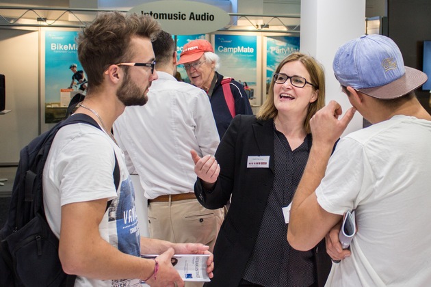 Bildunterschrift Foto 1: Informierte anlässlich der Preisverleihung über Kinder-Hörgerät ReSound Up Smart - Vertriebsaudiologin Steffi Ramlow (Mitte), Spezialistin für die Pädakustik-Produkte von ReSound (hier beim IFA-Auftritt des Herstellers 2016) (Foto: ReSound).