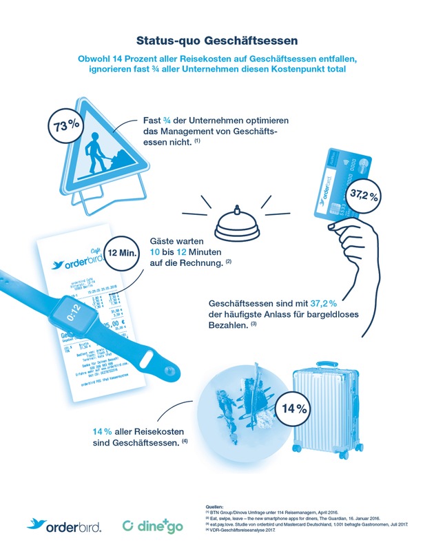Wie kann das Bezahlen der Zukunft gestaltet werden - und warum tun sich insbesondere Mobile-Payment-Verfahren häufig so schwer in Deutschland? Für den orderbird-Gründer Jakob Schreyer und Patrick W. Diemer, Managing Director & Chairman der AirPlus International, stand nach einem Treffen im Frankfurter Flughafen fest: Mobile Bezahlverfahren müssen einen echten Mehrwert bieten und das Bezahlen sollte beim Restaurantbesuch angenehm - nahezu unsichtbar - sein. Gemeinsam arbeiteten die beiden Unternehmen an einer Lösung. Das Ergebnis: Die neue iOS-App dine+go (https://dineandgo.com) von AirPlus International beendet das Abrechnungschaos und den Rechnungsstress für Geschäftsessen. Die gemeinsam mit dem iPad-Kassensystem-Marktführer orderbird entwickelte Idee erlaubt es Restaurantgästen, in einer App zu zahlen und Firmenessen einfach und finanzamtkonform abzurechnen.