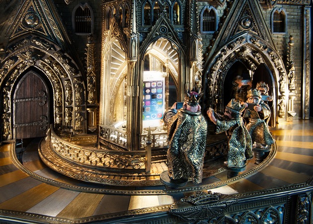 Krone, Zepter und Reichsapfel waren gestern - heute regiert das Smartphone! Ein hintersinniges Spiel mit den gegenwärtigen Insignien der Macht treibt der mehrfach ausgezeichnete Künstler Georg Dinkel aus Zirndorf. Folglich umkreisen und huldigen in seiner verblüffenden Installation "iMännleinlaufen" Kurfürsten (und eine historisch kaum zu belegende Kurfürstin) - allesamt ausgestattet mit Smartphones als standesgemäßen Symbolen - eine herrschaftliche Instanz von heute: Kaiser Karl IV. wurde einfach ersetzt durch ein kolossales, allmächtiges iPhone. Das 2,30 Meter hohe "iMännleinlaufen" aus FIMO ist vom 17. September bis 3. November in der Ehrenhalle des Nürnberger Rathauses zu sehen.