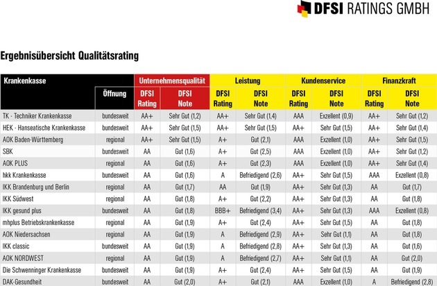 Unter den getesteten Kassen, die bundesweit geöffnet sind, schnitt die TK - Techniker Krankenkasse mit der Note 1,2 am besten ab. Mit einer Note von 1,5 ebenfalls noch sehr gut ist die HEK - Hanseatische Krankenkasse. Und unter den regional aktiven Krankenkassen konnte die AOK Baden-Württemberg ein "Sehr Gut" (Note 1,5) erringen. "Für die hohe Qualität der Krankenkassen, die sich unserem Test stellten, spricht zudem, dass weitere elf Versicherer bei der Gesamtnote eine Eins vor dem Komma haben. Und die schlechteste Note, die wir vergeben mussten, war die 2,4", fasst der DFSI-Geschäftsführer die Ergebnisse zusammen. "Dank des einzigartigen DFSI-Qualitätsratings können Kunden bei der Auswahl eines Gesetzlichen Krankenversicherers sehr einfach Kassen solche herausfiltern, die in allen drei Bereichen - zusätzliche Leistungen, Service und Finanzkraft - durch sehr gute Qualität überzeugen", erläutert Lemke den Kundennutzen der Untersuchung.