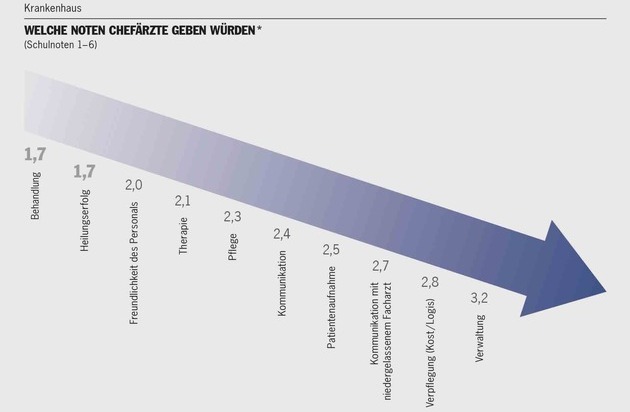 Wenn leitende Mediziner ihrem Krankenhaus Schulnoten aus Patientensicht geben müssten, dann würden Behandlung und Heilungserfolg am besten abschneiden - mit der Note 1,7. Eine glatte Zwei würden sie für die Freundlichkeit des Personals, die Kommunikation mit den Patienten, die Therapie und Pflege geben. Eher mit "Befriedigend" schneiden die Aufnahme der Patienten, Verpflegung und Unterbringung, der Austausch zwischen Klinik und niedergelassenem Facharzt sowie das Verhältnis zwischen Patienten und Verwaltung ab.