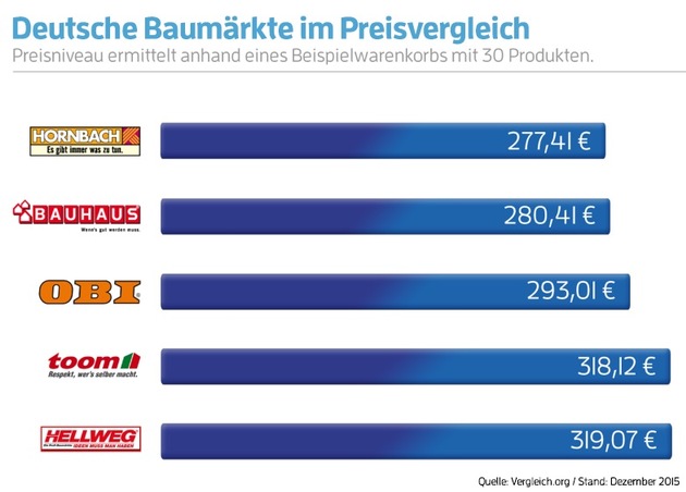 Vergleich.org hat fünf Berliner Filialen der großen Baumarktketten OBI, HELLWEG, HORNBACH, BAUHAUS und toom besucht. Anhand eines 30 Produkte umfassenden Testwarenkorbes haben die Tester ermittelt, welcher Deutschlands günstigster Baumarkt ist.