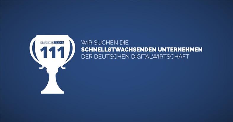 Gründerszene ist auf der Suche nach den 111 schnellstwachsenden Digitalunternehmen Deutschlands. Mit dem Wettbewerb Gründerszene 111 will das führende Onlinemagazin der Startup-Szene und Digitalwirtschaft ein offizielles und valides Wachstums-Ranking erstellen, das es so noch nicht gegeben hat. Unternehmen können sich vom 01.09.2015 bis zum 30.09.2015 online unter www.gruenderszene.de/gs-111 bewerben. Die 111 wachstumsstärksten Unternehmen werden im Anschluss umfangreich in der deutschen Medienlandschaft platziert und erhalten somit starke Sichtbarkeit und Branding.