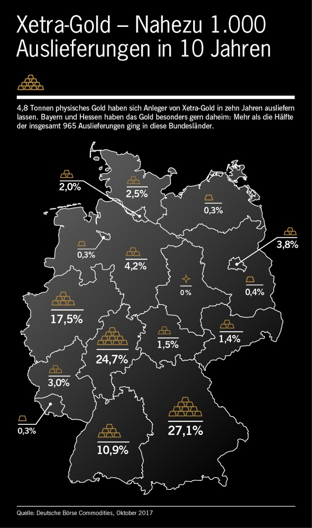 Xetra-Gold-Anleger haben Anspruch auf die Auslieferung des verbrieften physischen Goldes. Seit der Einführung von Xetra-Gold im Jahr 2007 haben Anleger davon 965 Mal Gebrauch gemacht. Dabei wurden insgesamt 4,8 Tonnen Gold ausgeliefert. Bayern und Hessen haben das Gold besonders gern daheim: Mehr als die Hälfte der Auslieferungen ging in diese Bundesländer.