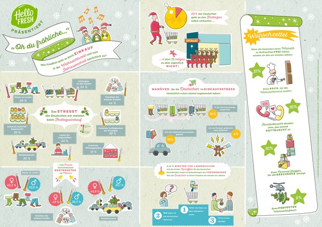 Jeder kennt ihn, den Last-Minute-Einkaufsstress vor Weihnachten und Silvester. Kurz vor Ladenschluss müssen noch die fehlenden Zutaten für das Weihnachtsmenü oder das Raclette-Essen an Silvester eingekauft werden. Eine von HelloFresh in Auftrag gegebene GfK-Umfrage zeigt, was die Leute in der Vorweihnachtszeit und vor dem Jahreswechsel beim Einkauf am meisten stresst und wie weit sie gehen würden, um das letzte Produkt seiner Art zu ergattern. Damit die Deutschen ihre Weihnachtszeit entspannter genießen können, bietet HelloFresh dieses Jahr erstmalig Weihnachts- und Silvesterkochboxen als entschleunigende Lösung an.