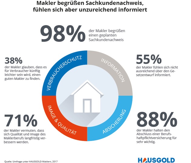 Die Maklervermittlung HAUSGOLD wollte wissen, was Immobilienmakler vom Sachkundenachweis halten. Das Ergebnis ist deutlich: 98 Prozent aller Makler, die mit HAUSGOLD zusammenarbeiten, begrüßen den Sachkundenachweis, halten ihn gar für längst überfällig. "Es gibt zu viele schwarze Schafe auf dem Markt, die ohne Sachkenntnisse Immobiliengeschäfte tätigen", so ein Immobilienmakler. Langfristig, so vermuten 71 Prozent der Makler, werde sich nicht nur die Qualität verbessern, sondern auch das Image des Maklerberufs. "Die Situation wird sich sicher erst nach Jahren ändern, denn es gibt nach wie vor viele alte Hasen am Markt, die nicht wirklich seriös handeln und keine bzw. nur eine sehr eingeschränkte Ausbildung haben."
