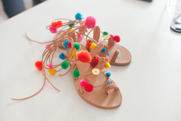 Benötigte Materialien: Ein Paar einfache Römer-Sandalen, Pompons in verschiedenen Größen und Farben, Anhänger wie Quasten, Münzen, Perlen etc., geknüpfte Bänder, kleine Metallringe, Nadel und Faden, eine Schere, Sekundenkleber oder Heißklebepistole. Alle Materialien sind auf www.etsy.com erhältlich.