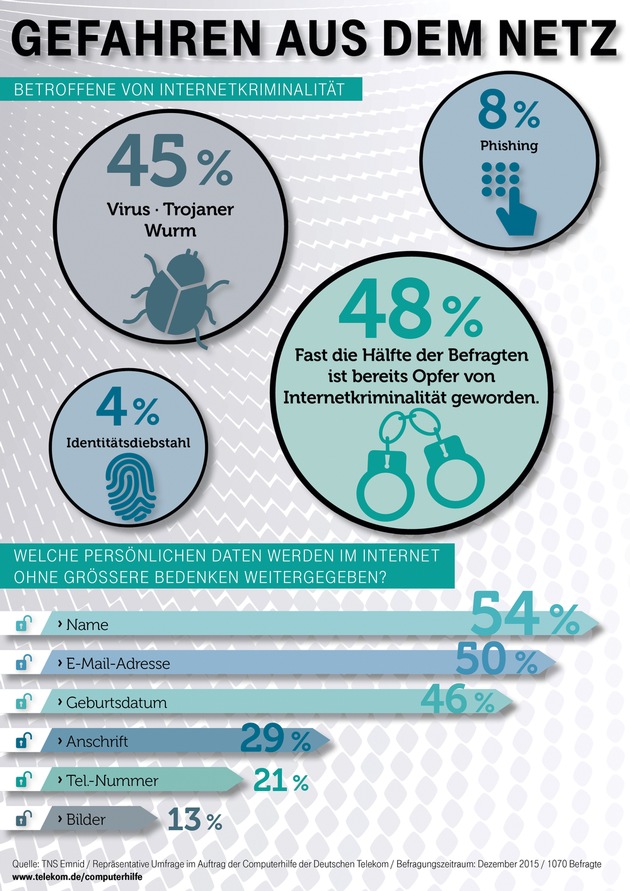 Fast die Hälfte der Deutschen (48 Prozent) sind bereits Opfer von Internetkriminalität geworden. Am häufigsten sind Internetnutzer aller Altersgruppen von Viren, Trojanern oder Computerwürmern betroffen, 45 Prozent sind schon einmal in Kontakt mit so genannter "Malware" gekommen. Es folgen Phishing-Delikte wie die Entwendung von Zugangsdaten mit acht Prozent sowie Identitätsdiebstahl mit vier Prozent Betroffenen. Das ist das Ergebnis einer aktuellen Umfrage von TNS Emnid im Auftrag der Computerhilfe der Deutschen Telekom. Die Meinungsforscher befragten 1.070 Internetnutzer nach ihrem Umgang mit persönlichen Daten im Internet zum "Safer Internet Day" am 9. Februar.