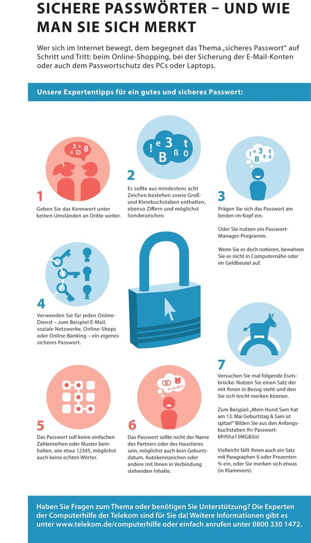 Wer sich im Internet bewegt, dem begegnet das Thema "sicheres Passwort" auf Schritt und Tritt: beim Online-Shopping, bei der Sicherung der E-Mail-Konten oder auch dem Passwortschutz des PCs oder Laptops. Die Computerhilfe der Telekom gibt folgende Tipps für ein gutes und sicheres Passwort: