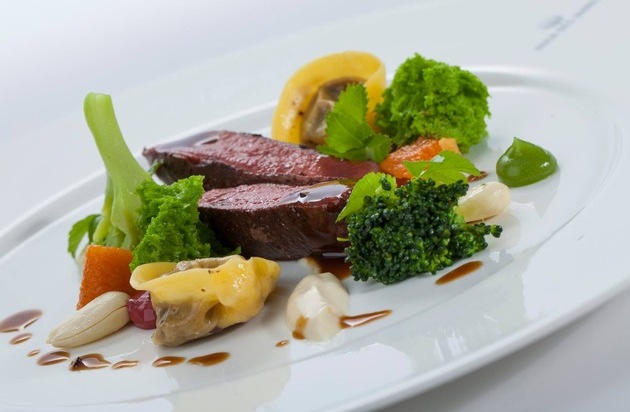 Sie empfiehlt einen 2015er Mas des Tannes Réserve Blanc des Weinguts Domaines Paul Mas. Dieser Wein spielt mit kräutigen und erdigen Aromen, die perfekt mit dem Löwenzahnwurzelragout verschmelzen. Er hat die Substanz und Ausgewogenheit, um mit den Rehravioli und mit den Essigzwetschgen zu brillieren. Durch seine milde Säure und die erdig-fruchtigen Komponenten begleitet er dieses Gericht perfekt. Als elegante Alternative bietet sich der PURE Pinot Noir der Domaine de Brau aus dem Jahrgang 2015 an. Dieser Spätburgunder glänzt durch Finesse und Frische sowie kühlen und feinen Aromen.