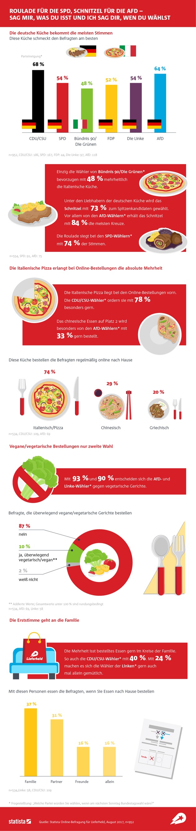 Sag mir, was du isst und ich sag dir, welche Partei du bei der Bundestagswahl 2017 wählst: Lieferheld analysiert Zusammenhang zwischen Parteineigung und Lieblingsessen