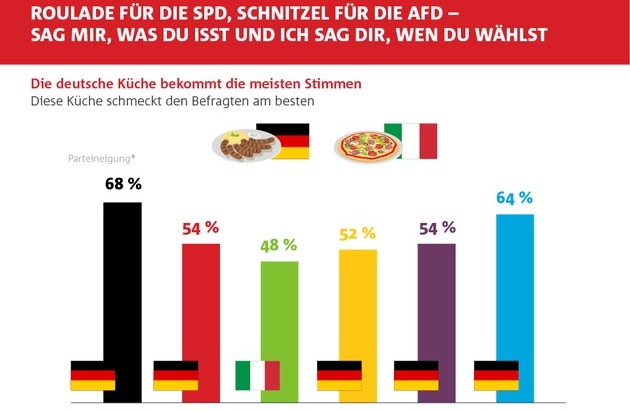 Die deutsche Küche bekommt die meisten Stimmen: Mit 58% der Wählerstimmen schmeckt dem Großteil der Deutschen die eigene Landesküche am besten und erreicht damit die absolute Mehrheit. Die CDU/CSU-Wähler sind sich mit 68% der Stimmen besonders einig und ernennen die deutsche Hausmannskost zu ihrem Favoriten. Auch die Spitzenkandidaten in dieser kulinarischen Kategorie stehen fest: Die Roulade siegt bei den SPD-Wählern mit 74% der Stimmen. Von den AfD-Wählern erhält das Schnitzel mit 84% die meisten Kreuze. FDP-Anhänger wählen den deftigen Eintopf mit 61% der Stimmen an die Spitze. Bei den Wählern der Grünen entscheidet hingegen die italienische Küche mit 48% der Stimmen diese Wahl für sich und lässt die deutsche auf dem zweiten Platz hinter sich.