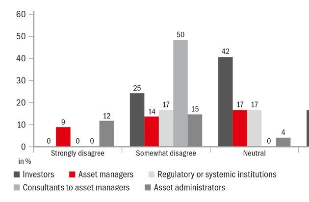 Die Innovationskraft bzgl. geeigneter AM Solutions und Produkte wird vom Gesamtmarkt eher kritisch eingeschätzt, die Qualität international akzeptierter Investmentlösungen nur als mittelmäßig beurteilt. Dagegen werden die Schweizer Asset Manager von der Gesamtheit der Teilnehmer aktuell als international überlegen bewertet, wobei sich dieser Vorsprung nach Ansicht der Studienteilnehmer noch weiter vergrößern dürfte. Das positivste Urteil zur Qualität der Asset Manager stammt bezeichnenderweise von diesen selbst - und liegt deutlich über den Einschätzungen anderer Teilnehmergruppen, insbesondere der Investoren.