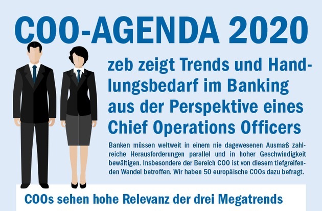 Der Tätigkeitsbereich eines Chief Operating Officer (COO) steht vor dem Hintergrund von Digitalisierung, Regulatorik und Rentabilitätsdruck als eine der zentralen Positionen in der Bankorganisation vor großen Herausforderungen. Obgleich der Handlungsdruck von fast allen befragten COOs geteilt wird, liegt die Umsetzung konkreter Maßnahmen in vielen Feldern deutlich hinter dem eigenen Anspruch zurück. So sind aktuell weder die hohen digitalen Kundenerwartungen realisierbar, noch ist es den Instituten bisher gelungen, eine effektive und effiziente Compliance aufzubauen. Vor dem Hintergrund weiterer Kosteneinsparungen setzt die Mehrzahl der befragten COOs zudem auf eine erhebliche Optimierung und Professionalisierung des Kostenmanagements. Außerdem gehen die COOs davon aus, dass sich sowohl die Anzahl wie auch die Umsetzungsgeschwindigkeit notwendiger Projekte in den nächsten Jahren signifikant erhöhen wird. Dies sind die zentralen Ergebnisse der jetzt veröffentlichten Studie "COO-Agenda 2020" von zeb. Die Strategie- und Managementberatung, spezialisiert auf Unternehmen der Financial-Services-Industrie, hatte für die Untersuchung 50 Chief Operating Officer namhafter europäischer Banken befragt und daraus Trends sowie Handlungsbedarf im Banking abgeleitet.