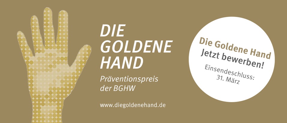 Aus dem Präventionspreis der Berufsgenossenschaft Handel und Warenlogistik (BGHW) wird "Die Goldene Hand". Unter diesem einprägsamen Namen soll der Preis aufgewertet, unverwechselbar und damit noch bekannter werden. Mitgliedsunternehmen der BGHW können sich ab sofort für "Die Goldene Hand", den bundesweit wichtigsten Preis für sichere und gesunde Arbeitsplätze im Handel und in der Warenlogistik, bewerben. Einsende-Stichtag ist der 31. März 2017.