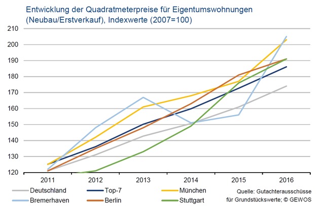 Bereits seit einigen Jahren ist die Marktentwicklung in Deutschland von Preisanstiegen geprägt. Besonders kräftige Steigerungen gab es bei neuen Eigentumswohnungen. Im Rahmen der IMA® erfasst GEWOS jedes Jahr die tatsächlichen Kaufpreise für erstverkaufte Neubauwohnungen. Im Jahr 2016 haben sich die durchschnittlichen Quadratmeterpreise bundesweit um 8 % erhöht. Seit dem Jahr 2007 ergibt sich ein Preisanstieg um 74 %, in den sieben größten deutschen Städten stiegen die Preise um 86 % (vgl. Abb.1). Einzelne Städte zeigten sogar noch weitaus kräftigere Steigerungen: In München haben sich die Preise in den vergangenen zehn Jahren mehr als verdoppelt (+103 %), in Berlin und Stuttgart waren Neubauwohnungen im Jahr 2016 rund 91 % teurer als noch in 2007. Die größte Steigerung gab es mit +105 % jedoch in Bremerhaven - allerdings von einem niedrigen Niveau in 2007 ausgehend.