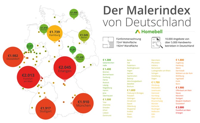 In Gelsenkirchen, Halle (Saale) und Bremen sind Malerarbeiten am günstigsten; sie liegen rund 20 Prozent unter dem Bundesschnitt. Zu diesem Ergebnis kommt der Malerindex von Homebell, Deutschlands führendem Online-Anbieter von Handwerkerdienstleistungen. Der Index führt auf, wie hoch die Malerkosten für eine Fünfzimmerwohnung (inklusive Bad und Küche) mit 72 m² Wohnfläche und 192 m² Wandfläche in Deutschlands Städten sind. Für die Entwicklung des Index hat Homebell 10.000 Angebote von über 5.000 Handwerksbetrieben in Deutschland miteinander verglichen. Der landesweite Durchschnittspreis liegt bei 1.669 Euro. Am meisten kosten Malerarbeiten in Erlangen, Frankfurt am Main und Düsseldorf. Die drei Städte liegen circa 20 Prozent über dem Bundesschnitt.