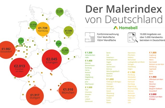 In Gelsenkirchen, Halle (Saale) und Bremen sind Malerarbeiten am günstigsten; sie liegen rund 20 Prozent unter dem Bundesschnitt. Zu diesem Ergebnis kommt der Malerindex von Homebell, Deutschlands führendem Online-Anbieter von Handwerkerdienstleistungen. Der Index führt auf, wie hoch die Malerkosten für eine Fünfzimmerwohnung (inklusive Bad und Küche) mit 72 m² Wohnfläche und 192 m² Wandfläche in Deutschlands Städten sind. Für die Entwicklung des Index hat Homebell 10.000 Angebote von über 5.000 Handwerksbetrieben in Deutschland miteinander verglichen. Der landesweite Durchschnittspreis liegt bei 1.669 Euro. Am meisten kosten Malerarbeiten in Erlangen, Frankfurt am Main und Düsseldorf. Die drei Städte liegen circa 20 Prozent über dem Bundesschnitt.